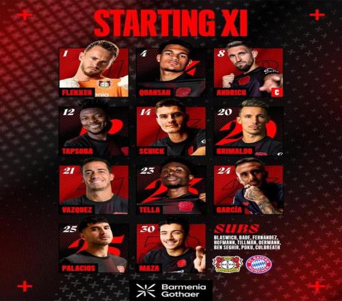 北京时间4月23日凌晨2点45分,德国杯半决赛展开一场焦点战役,拜仁对阵勒沃库森。赛前,双方公布首发阵容。