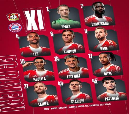 拜仁首发:1-诺伊尔、44-斯塔尼希奇、2-于帕梅卡诺、4-约纳坦-塔、27-莱默尔、6-基米希、45-帕夫洛维奇、10-穆西亚拉、14-路易斯-迪亚斯、17-奥利塞、9-凯恩