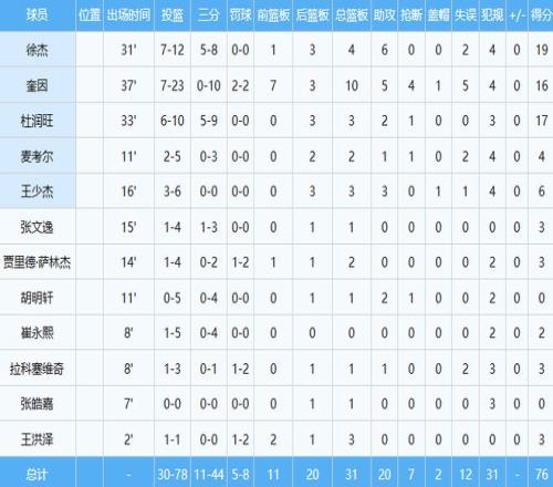 广东男篮全队投篮78中30,命中率低至约38%,其中三分球44中11,命中率只有25%。