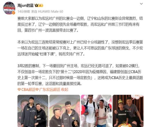 据媒体人透露:广东队主场大量球迷倒戈,高喊“杜锋下课”。季后赛首轮为3战2胜,意味着广东队再输一场就得回家钓鱼。