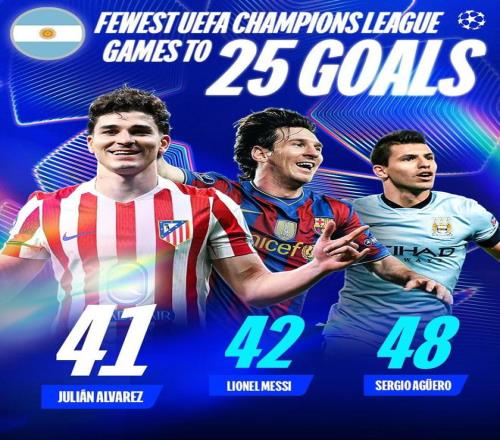 据统计,阿根廷球员中,阿尔瓦雷斯是欧冠打入25球所用场次最少的,梅西用了42场,阿圭罗则用了48场。