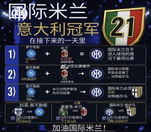 目前意甲积分榜上,国米79分,领先那不勒斯10个积分,在还剩四轮比赛的情况下,只要下一场比赛回到主场顺利拿下帕尔马,国际米兰便可以提前三轮拿下俱乐部第21冠;而一旦早一天进行的科莫主场对阵那不勒斯的比赛当中,科莫能够战胜那不勒斯的话,国际米兰将不战而胜,直接可以在主场列队庆祝了。