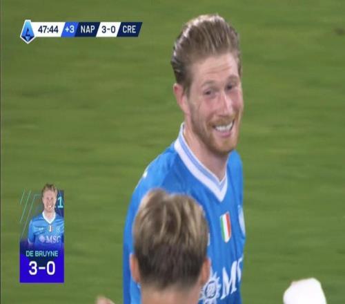 此役主场对阵克雷莫内塞,首发出战的德布劳内在上半场补时阶段打入一球,帮助那不勒斯取得3-0领先。