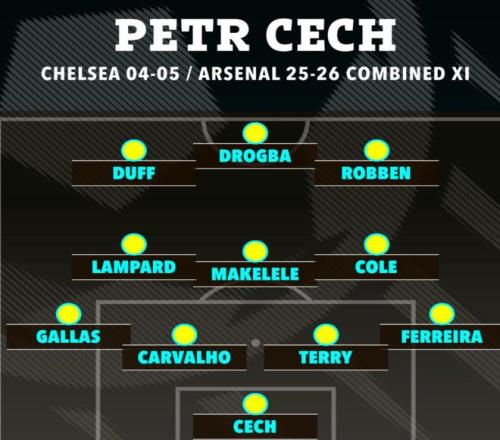 切赫职业生涯前11年效力切尔西,拿下四座英超冠军与欧冠奖杯,之后转会阿森纳。在组建这套终极首发阵容时,他毫不犹豫全部选择切尔西旧部,完全舍弃阿森纳现役球星。