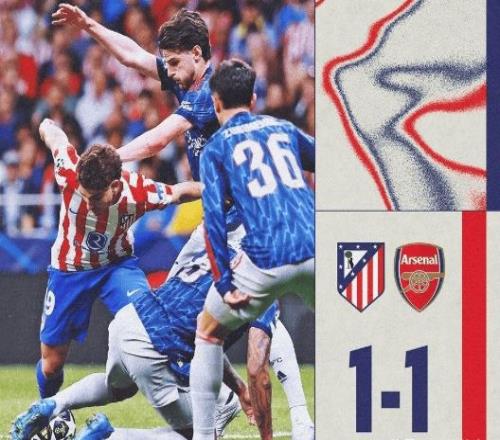 次回合5月6日酋长球场,马竞得客场抢分。算上这场,马竞近8次欧冠淘汰赛0-1落后,只逆转1次(2023年淘汰国米)。马竞半决赛近10场2平7负,唯一赢的还是2月国王杯4-0巴萨——这次面对阿森纳,真没底气。