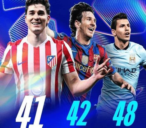 最炸的当属阿尔瓦雷斯!他欧冠41场轰25球,比梅西快1场(梅西42场),比阿圭罗快7场。阿根廷球迷都喊“神了”!本赛季欧冠14场进10球,创了马竞队史纪录。这小子26岁,欧冠生涯已进25球,阿根廷前三(仅次于梅西、阿圭罗),比梅西还快——这数据不吹,真硬核。