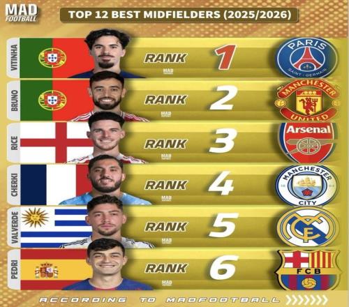 排在第三的赖斯则是另一种情况。阿森纳高居英超榜首,赖斯联赛31场4球5助。数据不如B费亮眼,但他的防守覆盖、对抗硬度、攻守转换的枢纽作用和硬仗能力极稳。他和B费的高低,纯粹是评委在不同中场类型之间的取舍。